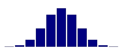 Was nun sind aber die zu erwartenden Wahrscheinlichkeiten im Falle eines idealen Zufalls? Es sind bei 10 Ereignissen und zwei Möglichkeiten insgesamt 1024 Verläufe denkbar, die zu folgender idealen Wahrscheinlichkeitsverteilung führen - selbstverständlich ist es eine Glockenkurve: