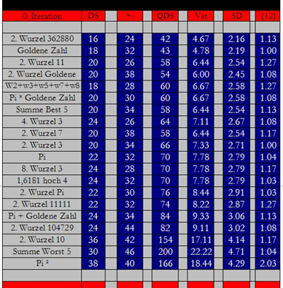 Abschließend die exakten Werte, die die 20 Zahlenfolgen im Ranking von