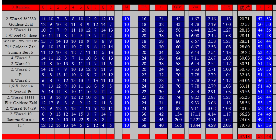 Zuletzt habe ich die fünf ganz oben im Ranking liegenden Zahlenfolgen genommen und addiert - und aus der Additionszahlenfolge dann erneut die Häufigkeit untersucht. Ebenso verfuhr ich mit den fünf Werten mit der höchsten Abweichung vom Mittelwert.